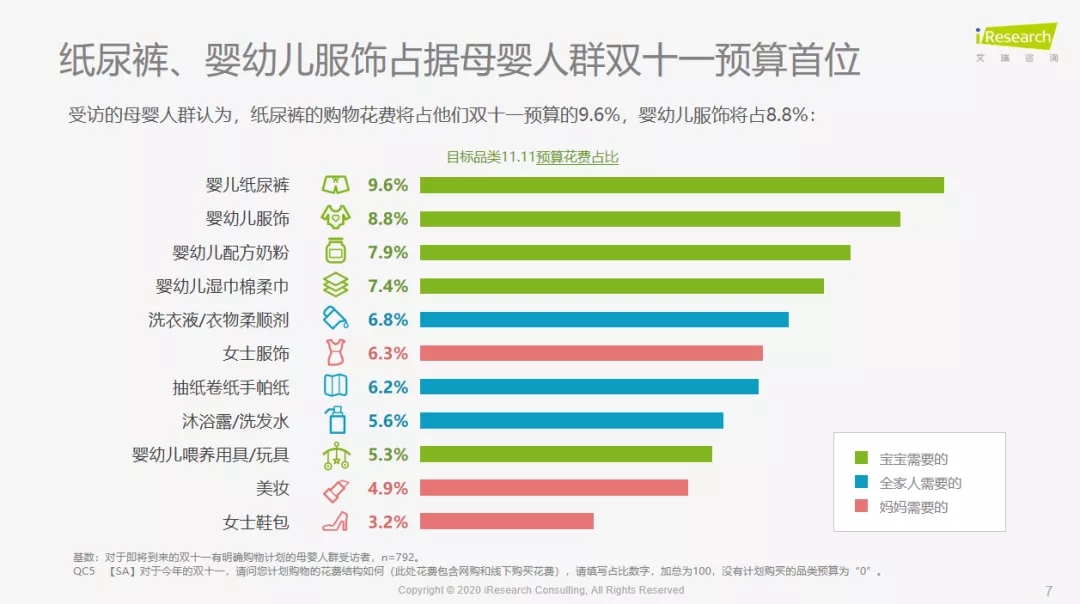 據(jù)艾瑞咨詢《2020年雙十一母嬰品類消費(fèi)行為前瞻洞察》報(bào)告顯示,在對(duì)雙十一有明確購物計(jì)劃的母嬰人群中,紙尿褲和嬰幼兒服飾占據(jù)母嬰人群雙十一預(yù)算首位,其中,紙尿褲的購物花費(fèi)將占到他們雙十一預(yù)算的9.6%,嬰幼兒服飾將占8.8%。