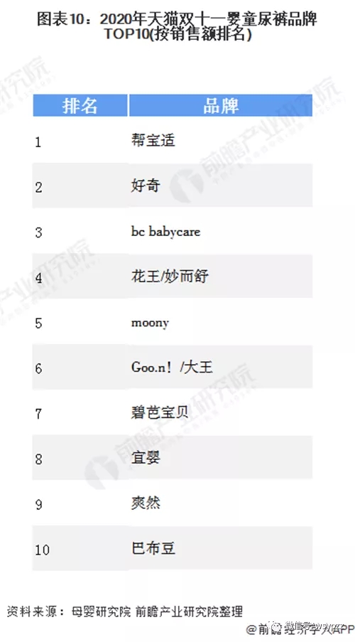 作為母嬰領(lǐng)域剛需、高頻的消費(fèi)類目,紙尿褲需求量巨大,由于父母對于嬰幼兒健康愈發(fā)重視,消費(fèi)者對于紙尿褲的品牌同樣重視。2020年天貓雙十一嬰童尿褲品牌TOP10中,幫寶適毫不疑問依然位居首位。