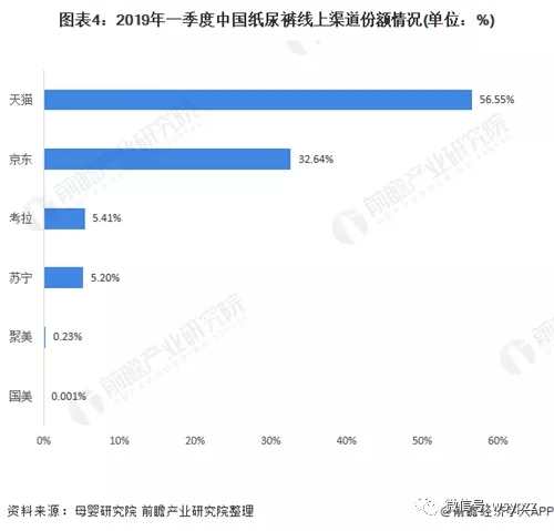 可見,線上渠道是紙尿褲銷售的重要渠道。2019年第一季度,紙尿褲銷售額達(dá)48.1億元,同比增長12.6%。其中天貓平臺(tái)保持其“一哥”優(yōu)勢,銷售額27.2億元,占比56.5%。京東平臺(tái)銷售額15.7億元,占比32.6%,同比增長6.1%。在增長率上,考拉出現(xiàn)了20.2%的負(fù)增長,蘇寧實(shí)現(xiàn)了214.8%的超高速增長。.jpg)