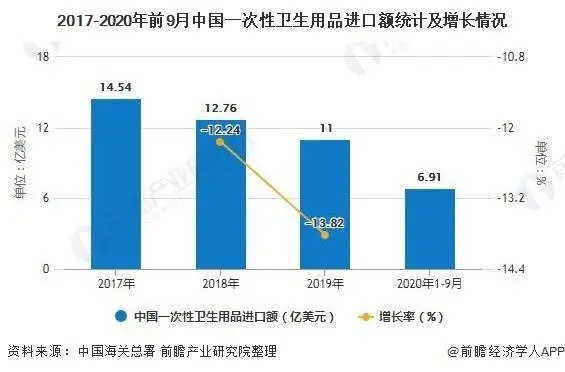 我國一次性衛(wèi)生用品行業(yè)進(jìn)口金額不斷縮減,2019年僅為11億美元,同比下降13.82%。2020年前三季度為6.91億美元。