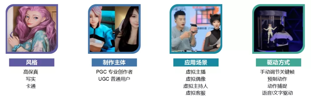 對于虛擬人的技術(shù)分類,我們可以從風(fēng)格、創(chuàng)作主體、應(yīng)用場景、驅(qū)動方式幾個方面進行了解: