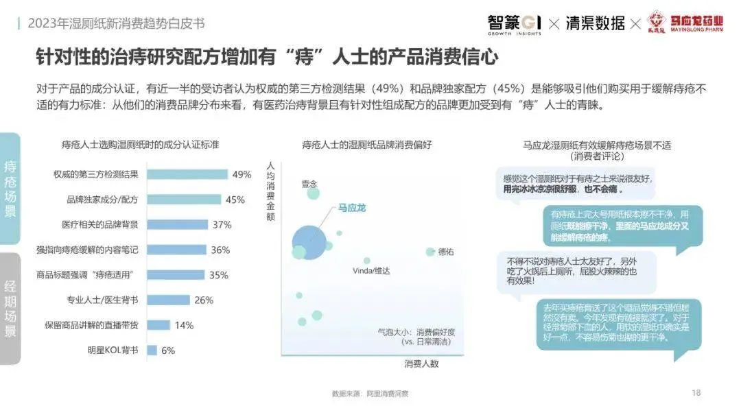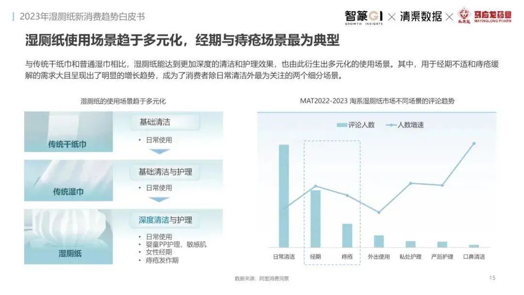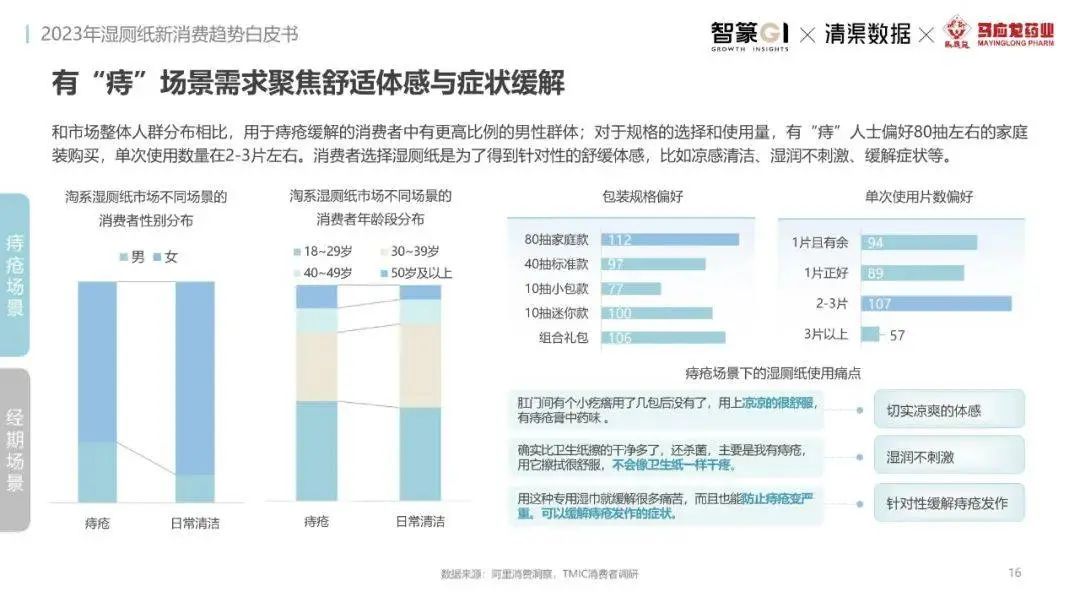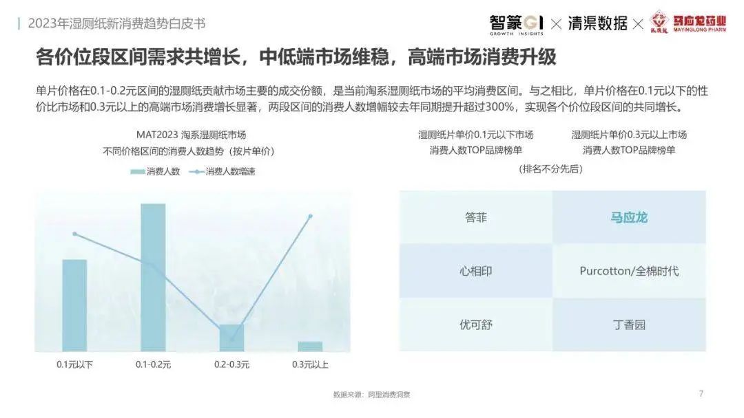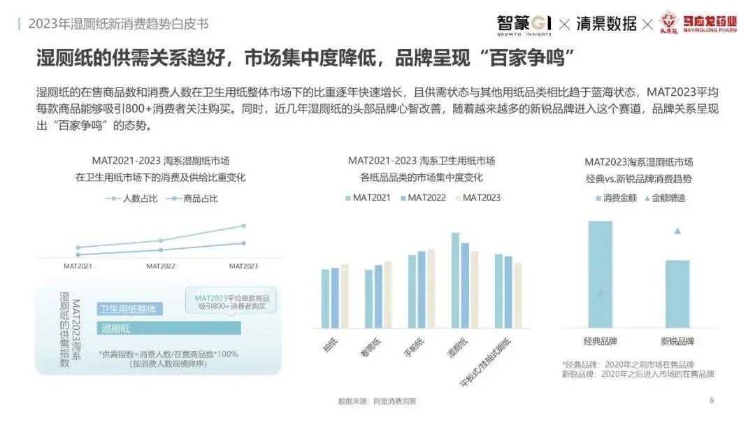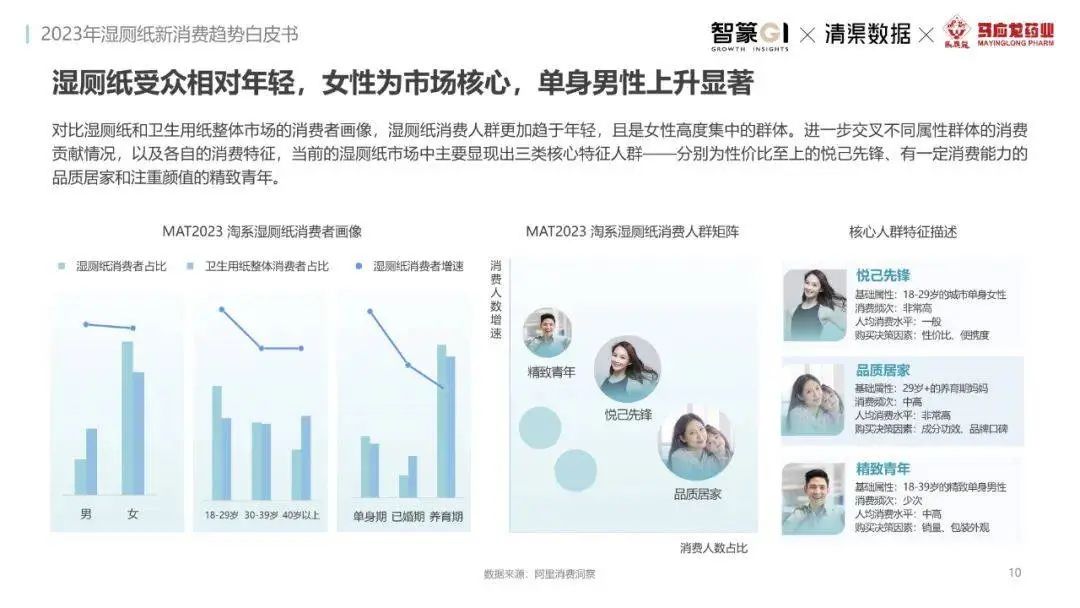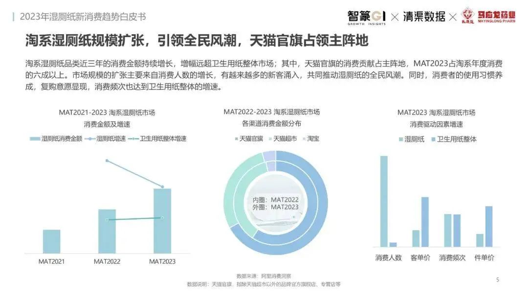 淘系濕廁紙品類近三年的消費(fèi)金額持續(xù)增長(zhǎng),增幅遠(yuǎn)超衛(wèi)生用紙整體市場(chǎng),其中,天貓官旗的消費(fèi)責(zé)獻(xiàn)占主陣地,MAT2023占淘系年度消費(fèi)的六成以上,市場(chǎng)規(guī)模的擴(kuò)張主要來自消費(fèi)人數(shù)的增長(zhǎng),有越來越多的新客涌入,共同推動(dòng)溫廁紙的全民風(fēng)潮,同時(shí),消費(fèi)者的使用習(xí)慣養(yǎng)成,復(fù)購(gòu)意愿顯現(xiàn),消費(fèi)頻次也達(dá)到衛(wèi)生用紙整體的增速。