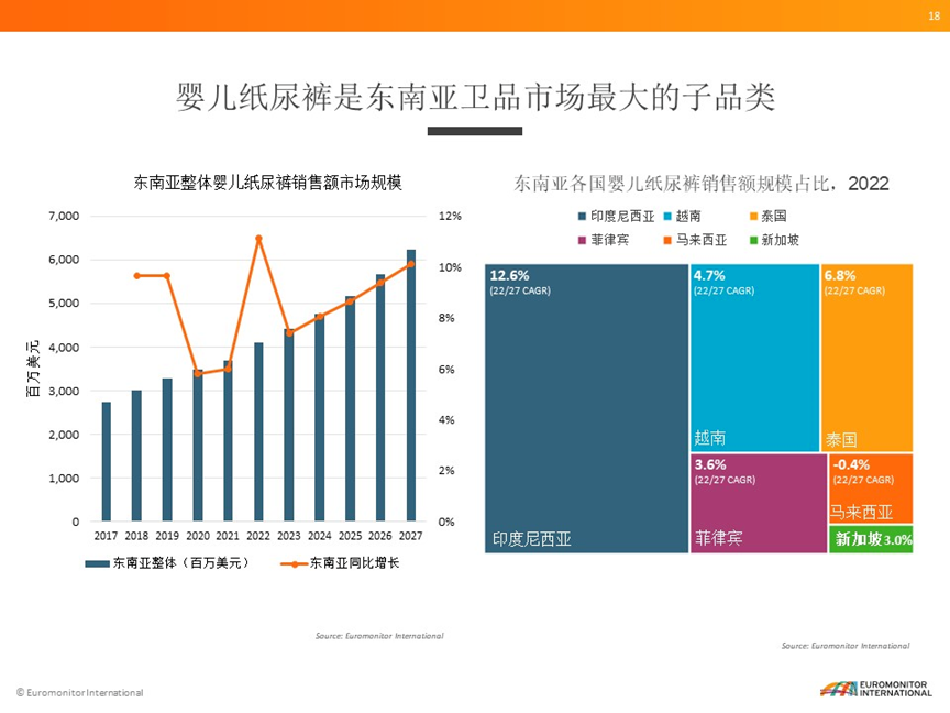 眾多紙尿褲品牌對(duì)東南亞市場(chǎng)情有獨(dú)鐘背后,是可觀的市場(chǎng)前景。根據(jù)Euromonitor(歐睿信息咨詢)數(shù)據(jù)顯示,2022年東南亞一次性衛(wèi)品市場(chǎng)整體零售額達(dá)到了65億美元,其中嬰兒紙尿褲是東南亞衛(wèi)品市場(chǎng)最大的子品類,去年市場(chǎng)規(guī)模超過了40億美元,21-22年同比增長達(dá)到將近11%。預(yù)計(jì)2027年嬰兒紙尿褲市場(chǎng)會(huì)超過60億美元。