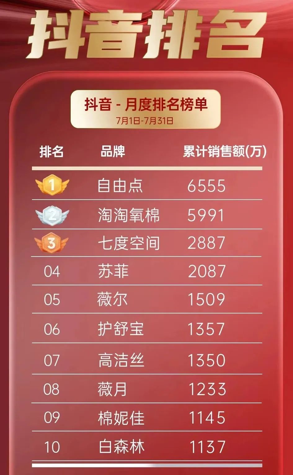 根據(jù)第三方數(shù)據(jù)平臺(tái)顯示,抖音平臺(tái)2024年7月份衛(wèi)生巾前十銷(xiāo)售榜單,其中,“自由點(diǎn)”品牌以6555萬(wàn)元的銷(xiāo)售額高居榜首,展現(xiàn)出了強(qiáng)大的市場(chǎng)號(hào)召力和消費(fèi)者認(rèn)可度。